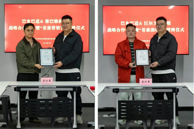 3月20日,市巴食巴適公司與四川秦巴雅韻文化發(fā)展有限公司、四川巨爾文化傳媒有限公司戰(zhàn)略合作簽約暨首席官授聘儀式在市巴食巴適公司會(huì)議室舉行。四川秦巴雅韻文化發(fā)展有限公司總經(jīng)理李泓江受聘擔(dān)任“首席營銷官”(CMO),四川巨爾文化傳媒有限公司運(yùn)營總監(jiān)郭有成受聘擔(dān)任“首席戰(zhàn)略官”(CSO)。此次雙簽約、雙授聘,標(biāo)志著“巴食巴適”品牌建設(shè)在文化賦能與戰(zhàn)略傳播兩個(gè)維度同步發(fā)力,邁入?yún)f(xié)同發(fā)展新階段。