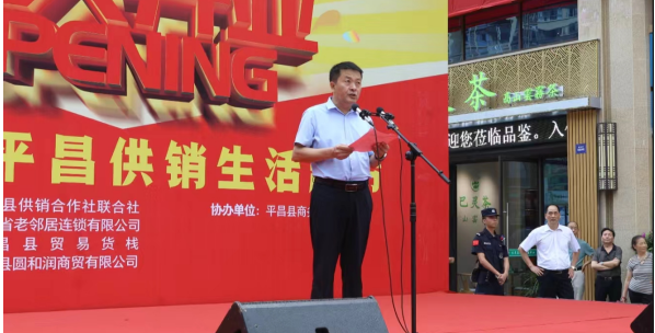 中共平昌縣縣委副書記曹光輝代表平昌縣委、縣政府致辭。他指出,省供銷社及直屬集團(tuán)公司對平昌縣供銷社給予了高度重視和大力支持,2021以來,向平昌縣支持了綜合改革、農(nóng)業(yè)社會(huì)化服務(wù)、茶葉產(chǎn)業(yè)等6個(gè)項(xiàng)目,投入項(xiàng)目補(bǔ)助資金1311萬元,使平昌成為首個(gè)全省供銷系統(tǒng)為農(nóng)服務(wù)綜合平臺(tái)建設(shè)試點(diǎn)縣。他認(rèn)為,“老鄰居•平昌供銷生活超市”的順利開業(yè),標(biāo)志著平昌供銷為農(nóng)服務(wù)綜合平臺(tái)試點(diǎn)縣建設(shè)取得了重要成果,也預(yù)示著“老鄰居”品牌在平昌這片熱土上的新生,這一創(chuàng)新舉措既是強(qiáng)基固本、優(yōu)城興業(yè)的生動(dòng)體現(xiàn),更是開放合作、守正創(chuàng)新的具體實(shí)踐。他強(qiáng)調(diào),“老鄰居•平昌供銷生活超市”連鎖網(wǎng)絡(luò)的問世,給平昌人民提供了大量的就業(yè)崗位,彰顯出“保供、保質(zhì)、穩(wěn)價(jià)”公有制企業(yè)特性,為平昌經(jīng)濟(jì)社會(huì)帶來了全新的物流業(yè)態(tài)和消費(fèi)時(shí)尚。他表示,要以省市供銷社對平昌縣的重視和關(guān)懷為契機(jī),以《四川省供銷合作社條例》為準(zhǔn)則,以“兩個(gè)加快”為抓手,主動(dòng)擔(dān)當(dāng)作為,全面推進(jìn)供銷合作社綜合改革,奮力推動(dòng)供銷合作事業(yè)高質(zhì)量發(fā)展。