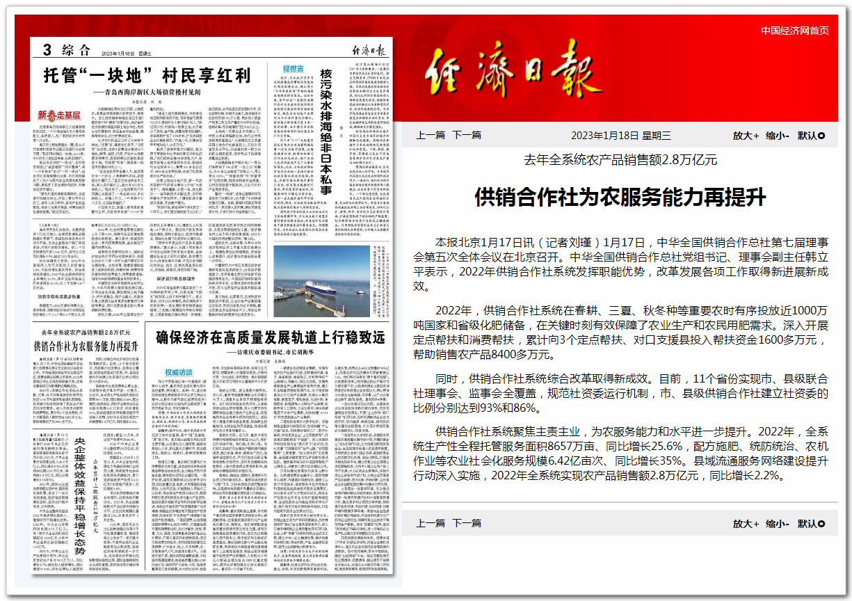 1月17日,中華全國(guó)供銷合作總社第七屆理事會(huì)第五次全體會(huì)議在北京召開。中華全國(guó)供銷合作總社黨組書記、理事會(huì)副主任韓立平表示,2022年供銷合作社系統(tǒng)發(fā)揮職能優(yōu)勢(shì),改革發(fā)展各項(xiàng)工作取得新進(jìn)展新成效。