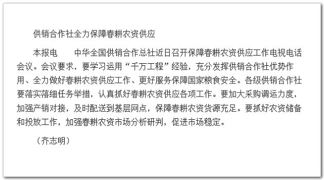 中華全國(guó)供銷合作總社近日召開保障春耕農(nóng)資供應(yīng)工作電視電話會(huì)議。會(huì)議要求,要學(xué)習(xí)運(yùn)用“千萬(wàn)工程”經(jīng)驗(yàn),充分發(fā)揮供銷合作社優(yōu)勢(shì)作用、全力做好春耕農(nóng)資供應(yīng)工作、更好服務(wù)保障國(guó)家糧食安全。各級(jí)供銷合作社要落實(shí)落細(xì)任務(wù)舉措,認(rèn)真抓好春耕農(nóng)資供應(yīng)各項(xiàng)工作。要加大采購(gòu)調(diào)運(yùn)力度,加強(qiáng)產(chǎn)銷對(duì)接,及時(shí)配送到基層網(wǎng)點(diǎn),保障春耕農(nóng)資貨源充足。要抓好農(nóng)資儲(chǔ)備和投放工作,加強(qiáng)春耕農(nóng)資市場(chǎng)分析研判,促進(jìn)市場(chǎng)穩(wěn)定。