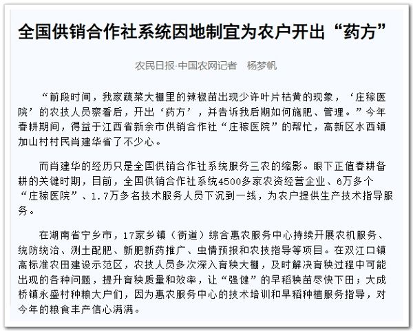 中華全國供銷合作總社相關負責人表示,為了滿足春耕大忙時節(jié)農民的實際需求,全國供銷合作社系統(tǒng)因地制宜開展生產性全程托管服務和配方施肥、統(tǒng)防統(tǒng)治、農機作業(yè)等農業(yè)社會化服務,充分發(fā)揮點多面廣、貼近基層的優(yōu)勢,不斷提升服務水平,為打好全年農業(yè)生產“第一仗”貢獻供銷力量。